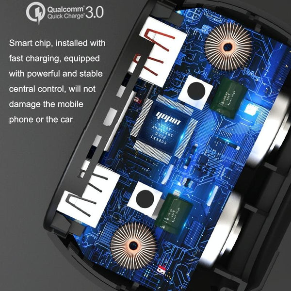 2. Voltage monitoring, independent switch, QC3.0 fast charging technology, double smoke hole, multi-angle rotation, intelligent constant temperature, intelligent chip, universal for 12-24V vehicles