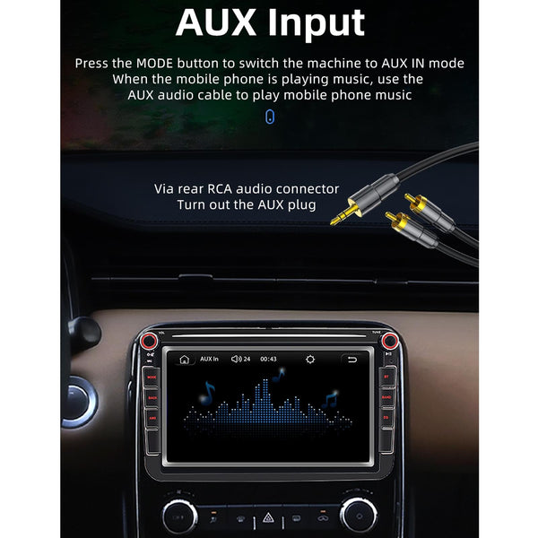 23. AUX function, press the MODE button to switch the machine to AUX IN mode. When the mobile phone is playing music, use the AUX audio cable to connect the mobile phone and the machine to transfer the mobile music to the car player