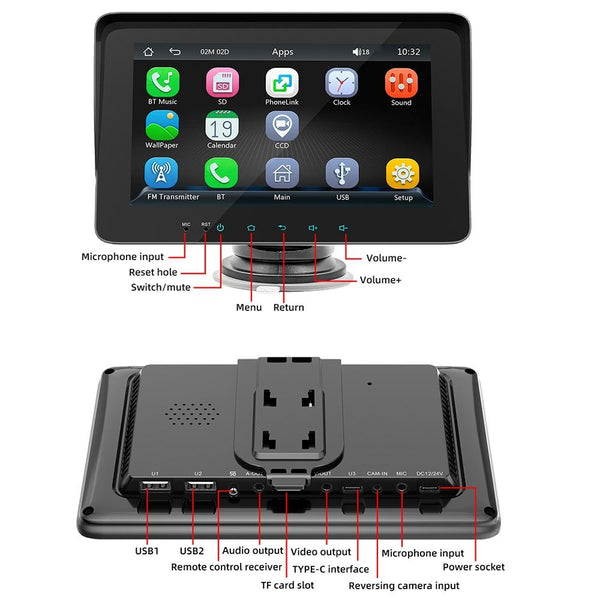 14. Supports mobile phone interconnection, reversing image, video warning playback, built-in speaker, TF card, steering wheel remote control, video output, reset button, Type-C interface