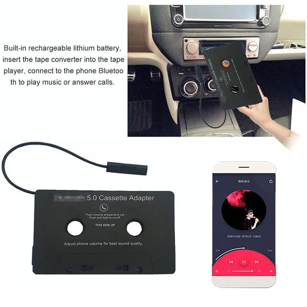 1. With the Bluetooth cassette adapter, your tape deck player instantly becomes a Bluetooth wireless cassette player. Used in your car or home system. Stream music from any Bluetooth-enabled device (such as iOS, Android-based electronics, Tablet PC, etc.).