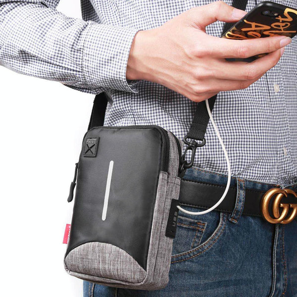 For 6-7 inch Mobile Phone Universal Silver Wire Canvas Waist Bag with Shoulder Strap & Earphone Hole & USB Cable Hole(Black Grey)