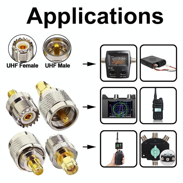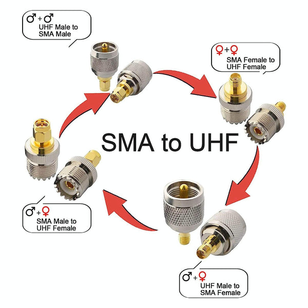 - Four common adapter types for versatile connectivity: UHF Female to SMA Male, UHF Female to SMA Female, UHF Male to SMA Female, and UHF Male to SMA Male