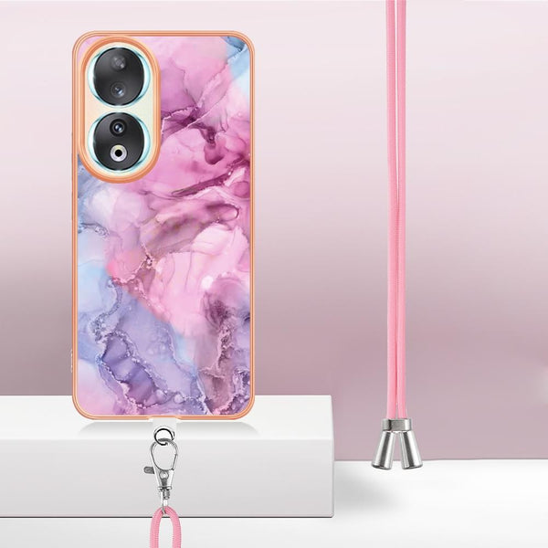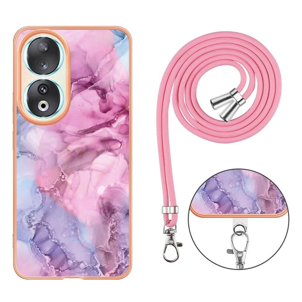 For Honor 90 5G Electroplating Marble Dual-side IMD Phone Case with Lanyard(Pink 013)