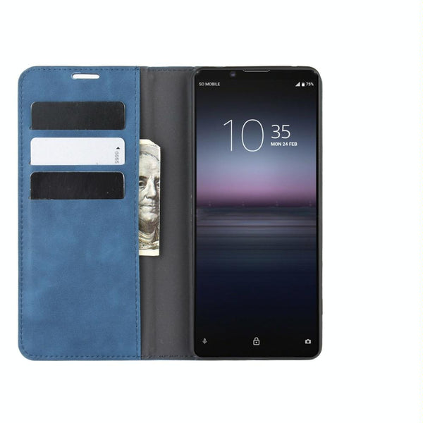 For Sony Xperia 1 II Retro-skin Business Magnetic Suction Leather Case with Holder & Card Slots & Wallet(Dark Blue)