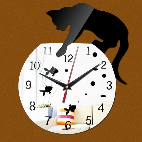 3D Acrylic Cat Mirror Wall Clock DIY Fashion Home Decoration(Silver Black)
