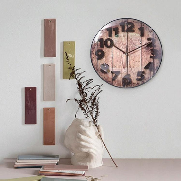 7. Three-dimensional numbers, curved glass, imitation wood grain clock face