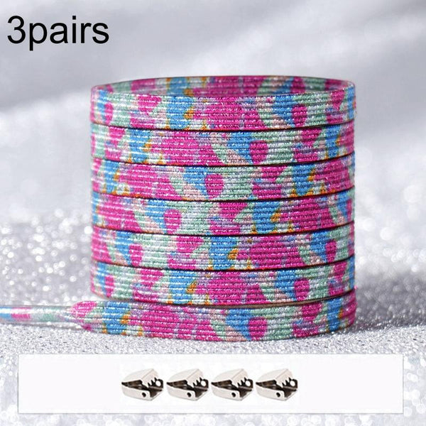 3pairs Elastic No Tie Shoelaces Metal Lock Dazzling Color Laces 100cm(Colorful Flower)