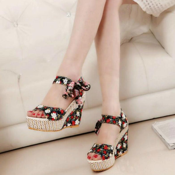 Bohemian Thick-Bottomed Fish Mouth Wedge With High-Heeled Flowers Wild Women's Shoes, Size:36(Black)