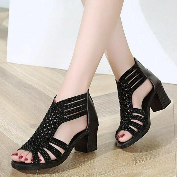 Crystal Hollow Out Peep Toe Wedges Sandals, Size:38(Black)