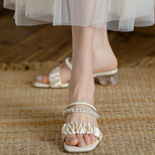 Silk Mesh Pearl Outerwear Crystal Mid-heel Sandals Sippers, Size: 37(Beige)