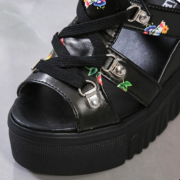 Summer Roman Sandals High Heel Floral Printed Cross Strap Women Shoes, Size: 39(Black)
