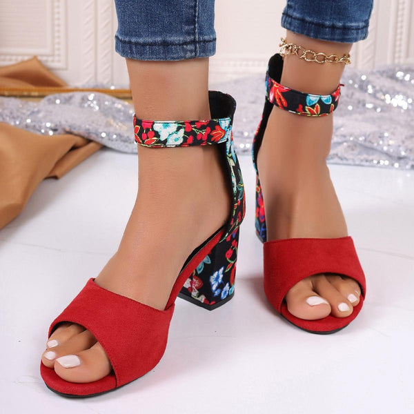 Summer Women Buckle High Heel Sandals Embroidered Chunky Ladies Sandals, Size: 40(Red)