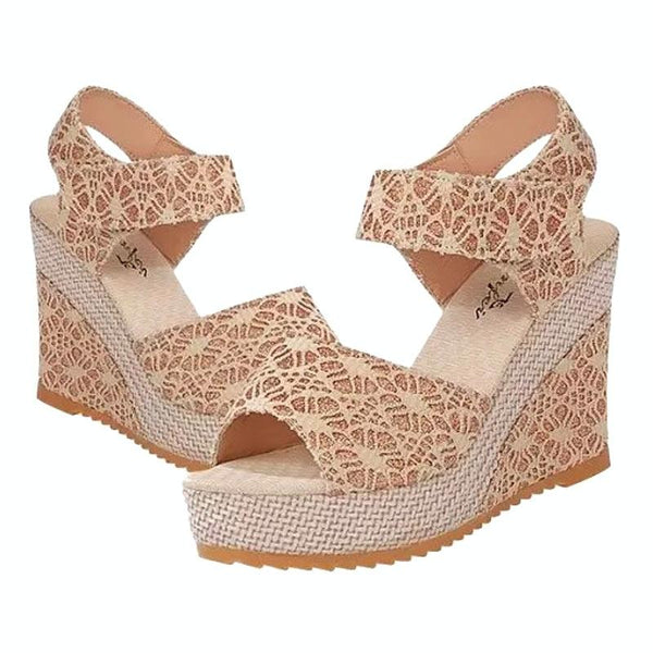 Summer Women Sandals Slope Heel Lace Open Toe Adhesive One Word Buckle Strap Muffin Thick Bottom Shoes, Size: 41(Ribbon Golden)