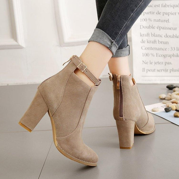 5. Design: round head, thick heel, belt buckle, middle tube, side zipper