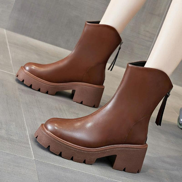 Women Short Boots Mid-calf Leather Thick Bottom Martin Boots, Size: 38(Brown)