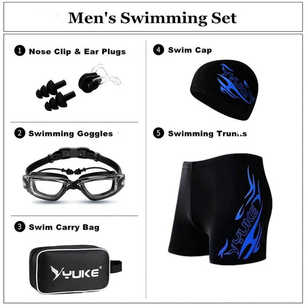 1. Men's swimming trunks set, including swimming trunks, cap, goggles, nose clip, earplugs, storage bag, one set to meet swimming needs