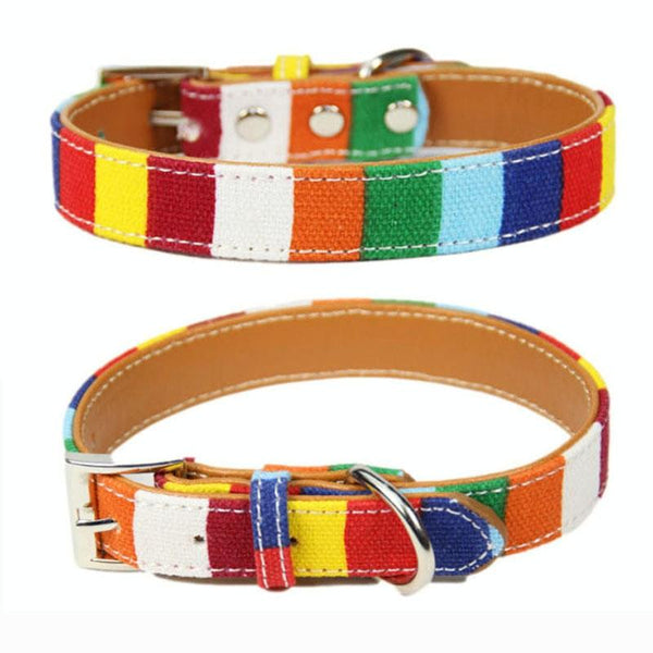 This stylish and durable Canvas+PU Colorful Strip Pet Dog Collar in Yellow (M, 2.0 x 40cm) is perfect for your furry friend. Made with robust polyester canvas featuring vibrant colourful stripes and backed with waterproof, dirt-resistant PU, this collar offers both comfort and practicality. The strong alloy buckle ensures secure fastening, while the easy-to-clean canvas material keeps it looking its best. Suitable for both cats and dogs.