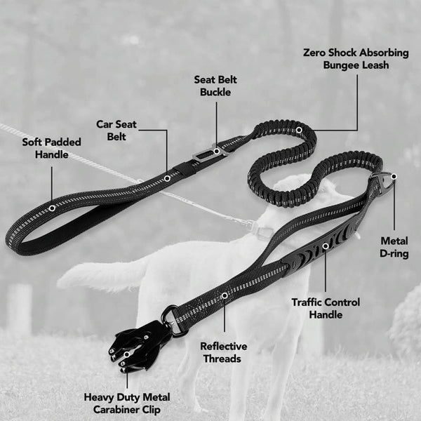 Control and comfort combined in our Heavy Duty Bungee Dog Leash. Crafted from durable, high-density polyester webbing, this leash is built to withstand even the strongest pulls from medium and large breeds. Multiple reflective strips woven into the design ensure enhanced visibility and safety during night-time walks.