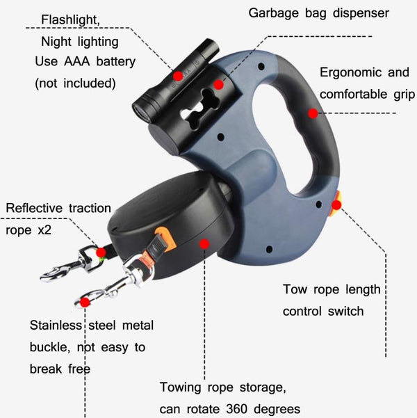 Keep your canine companion safe and under control with this robust dog tractor, suitable for medium and large breeds. Featuring an integrated LED light powered by a AAA battery (not included), this tractor ensures nighttime visibility for safer walks. Two reflective traction ropes provide added safety in low-light conditions, while a durable stainless steel buckle prevents escapes. The 360° rotating traction rope storage keeps the lead tidy when not in use. The ergonomic handle provides a comfortable grip for extended walks. Prevent your dog from straying and potential accidents with this practical and reliable dog tractor. Dimensions: 20x18x4.2cm (approx.). Rope length: 3 metres. Weight: 418g.