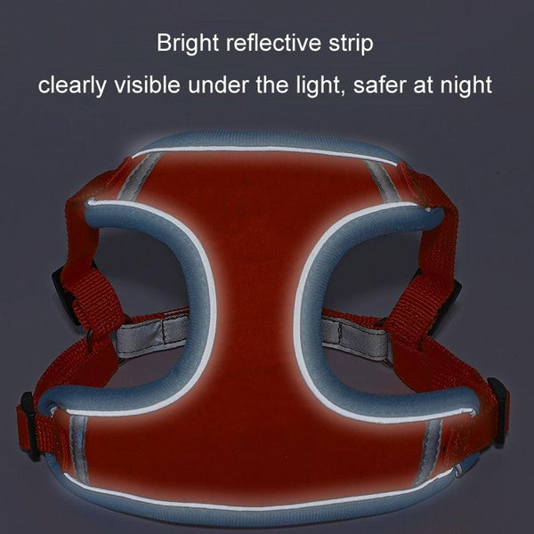 Keep your canine companion safe and stylish with this reflective, anti-breakaway dog harness in classic red. Crafted from lightweight, breathable suede, this vest-style harness ensures comfort for your dog during walks, even on warmer days. Highly visible reflective strips offer enhanced safety during nighttime strolls. Featuring a robust double D-ring buckle and secure fastenings, this harness provides reliable control and prevents escapes. Enjoy peace of mind knowing your dog is secure and comfortable with this stylish and practical harness. Available in size medium.