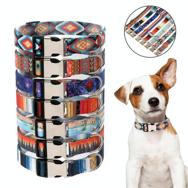 Dress your furry friend in style with this vibrant ethnic print dog collar. Crafted from durable polyester and cotton, this comfortable collar features a beautiful Maya Fans inspired design that complements any pet outfit or lead. The strong metal D-ring and buckle ensure secure fastening and long-lasting wear. Available in sizes Small (1.5cm x 27-43cm), Medium (2cm x 32-52cm), Large (2.5cm x 38-61cm) and Extra Large (2.5cm x 43-71cm), finding the perfect fit for your dog is easy. This stylish and practical collar is a must-have accessory for fashion-conscious pet owners.