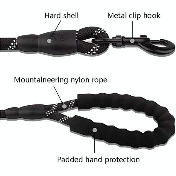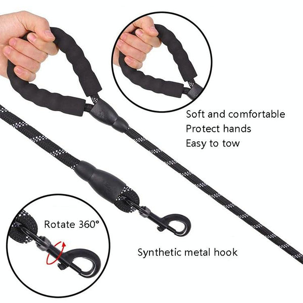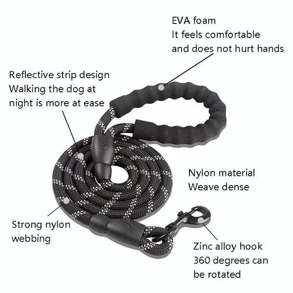 Enjoy comfortable dog walks day or night with this reflective dog lead, featuring a durable, densely woven nylon rope embedded with reflective thread for enhanced visibility in low light. The cushioned EVA foam handle provides a comfortable grip, preventing hand chafing during extended walks. A robust, 360° rotating zinc alloy hook ensures secure attachment to your dog's collar. This 150cm long, 1.2cm thick lead (red) offers the perfect balance of control and freedom for your canine companion.