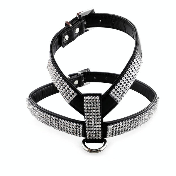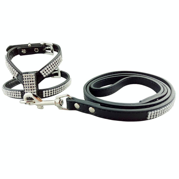 Rhinestone Dog Harness, PU Leather, Black, L, with Lead