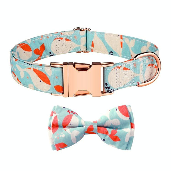 Dress your furry friend in style with this adorable Rose Gold Buckle Pet Detachable Bow Collar in a vibrant Orange Whale Love print. Crafted from durable polyester cotton for high colour fastness, this collar features a rose gold buckle for easy adjustments and secure fastening. The convenient D-ring allows for easy leash attachment and the addition of charming accessories. The double-layered detachable bow adds a touch of elegance without wrinkling, while the reinforced inner webbing provides extra strength and security for your pet. Available in size Small (1.5cm x 28-40cm) and suitable for neck sizes between 28-40cm. This lightweight collar (approx. 42g) is perfect for everyday wear and special occasions.