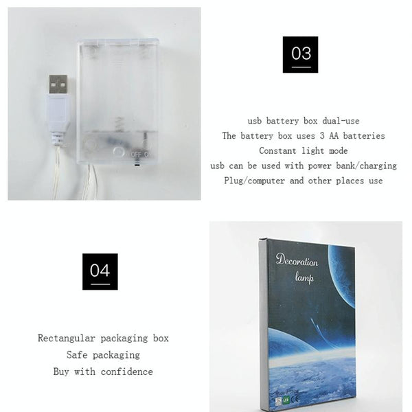 2. Power supply: USB cable / 3 x AA batteries (batteries not inclded)
