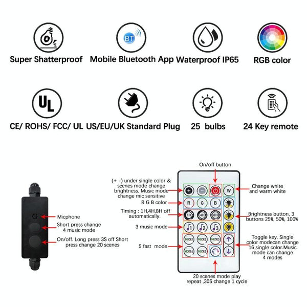 1. The intelligent colorful light string can provide 16 million kinds of colored lights, 16 kinds of monochrome, 20 kinds of scenes, and 4 kinds of music modes.