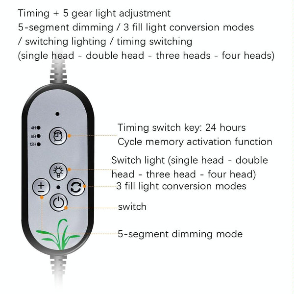 2. Timing + 5-speed light adjustment, 5-stage dimming/3 fill light conversion modes/switching lights/timed lighting (single head-double head-three heads-four heads)