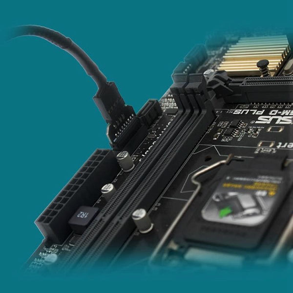 3. Plug the adapter into the USB2.0 9?pin socket of the motherboard, and then plug the 19P cable on the front of the chassis into the 19?pin socket of the connector.
