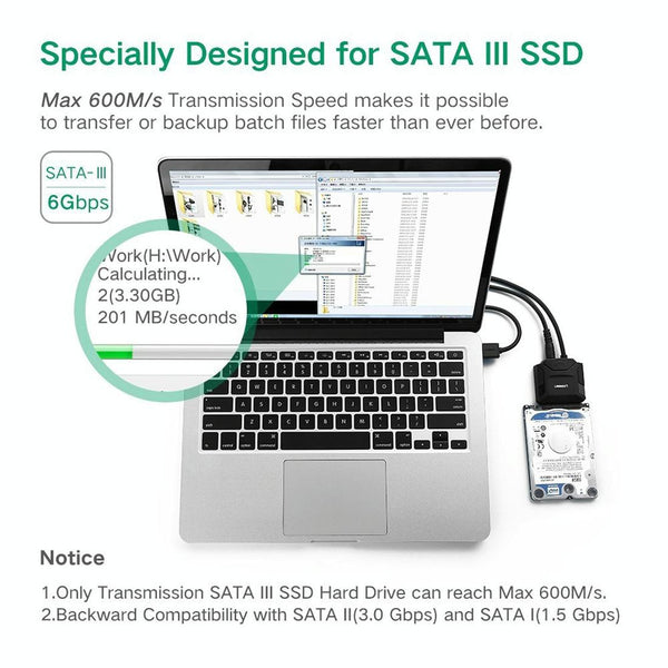 3. This usb sata adapter supports UASP Technology, which is 70% Faster than traditional USB 3.0 and 80% reduction in required processor resources, which enables you to utilize the full potential of your SATA III SSD/HDD, when paired with a UASP-enabled host controller. The UASP Transfer Protocol only can accelerate read and write speed of SSD hard disk.