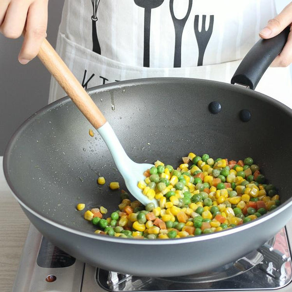 kn082 9 in 1 Wooden Handle Silicone Kitchen Tool Set with Storage Bucket(Pink)