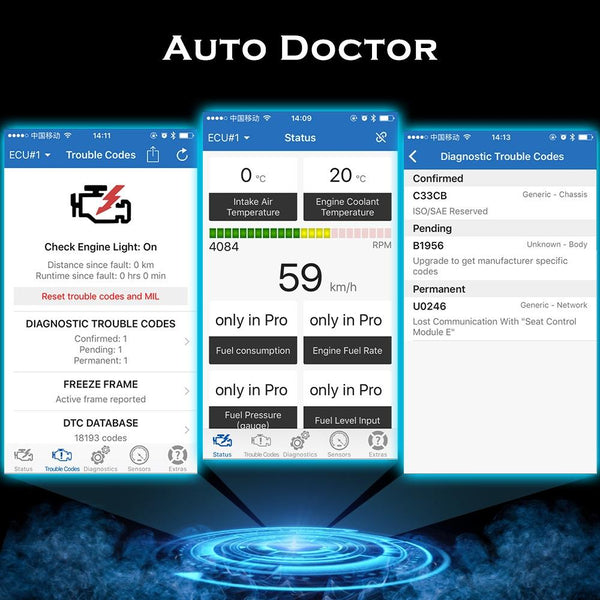 1. Read diagnostic trouble codes, both generic and manufacturer-specific, and display their meaning (over 3000 generic code definitions in the database).