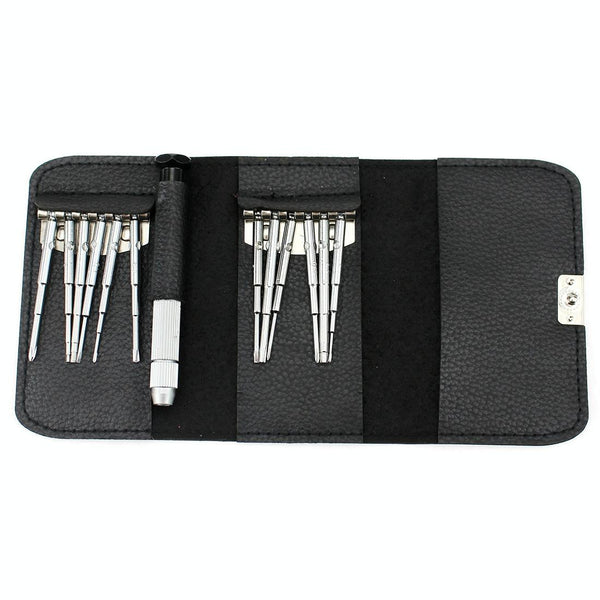 - 12 x Bits (Phillips: 1.0/1.3/1.5/2.0/2.5mm, Hex: 1.5/2.0/2.5mm, Slotted: 1.5mm, Pozidriv: 2.5mm, Torx: T6/T9)