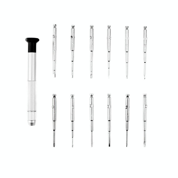 This portable 13-in-1 DJI Phantom Screwdriver Set is the perfect repair tool kit for any drone enthusiast. Compact and easy to carry, it's ideal for field repairs and routine maintenance. The kit includes a comfortable handle and 12 interchangeable bits catering to a variety of needs. Included are Phillips head (1.0, 1.3, 1.5, 2.0, 2.5mm), hex (1.5, 2.0, 2.5mm), slotted (1.5mm), Pozidriv (2.5mm), and Torx (T6, T9) bits, ensuring you have the right tool for any DJI Phantom repair. Keep your drone in top flying condition with this comprehensive and convenient screwdriver set.