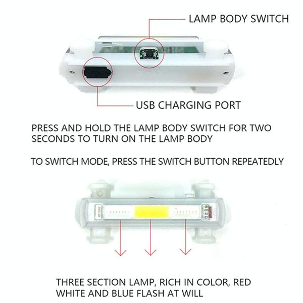 1. 7 lighting modes, three sections of lamps, colorful, red, white, blue flash at will