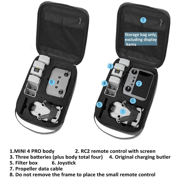 7. Capacity: Can hold the body, RC 2 or RC N2 remote control, original battery manager (the one from the subsidiary factory cannot be accommodated), 4 batteries (including 1 body), filter box, battery manager, and propeller data Line, rocker, etc.