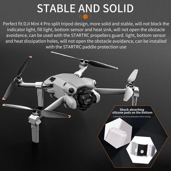 1. Specially designed for DJI Mini 4 Pro. It fits the Mini 4 Pro very well. The split tripod design will not block the indicator light, fill light, bottom sensor and heat dissipation hole. It will not open obstacle avoidance and can be used with the STARTRC paddle. Install and use together.