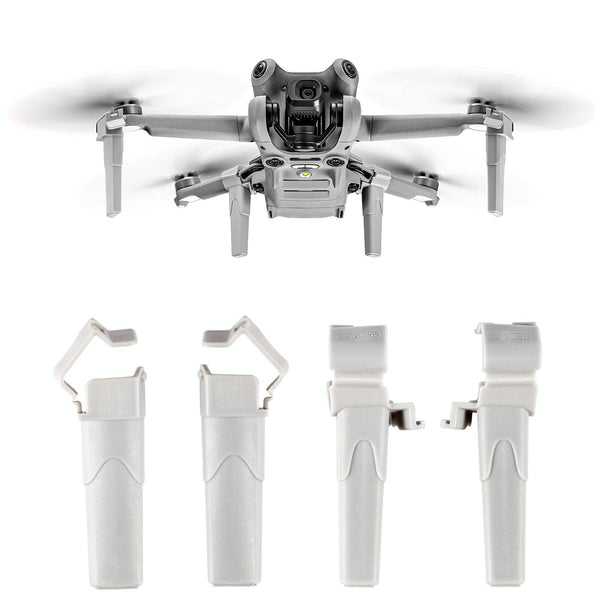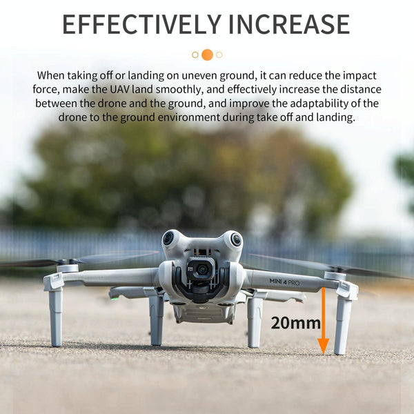 2. Can effectively increase the distance between the drone and the ground by 20 mm. When the Mini 4 Pro takes off or lands on uneven ground, it can reduce the impact force, allowing the drone to land smoothly, and protect the Mini 4 Pros body, sensors and gimbal camera from damage. This prevents ground debris or water stains from soiling or damaging the drone body, gimbal, and propellers. Effectively improves the Mini 4 Pro drone ability to adapt to the ground environment during takeoff and landing.