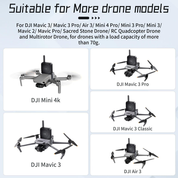 1. STARTRC mini speaker is suitable for DJI Mavic 3/ Mavic 3 Pro/ Air 3/ Mini 4 Pro/ Mini 3 Pro/ Mini 3/ Mavic 2/ Mavic Pro/ Holy Stone Drone/ RC Quadcopter and Multi-rotor Drone, suitable for drones with a load of more than 70g.