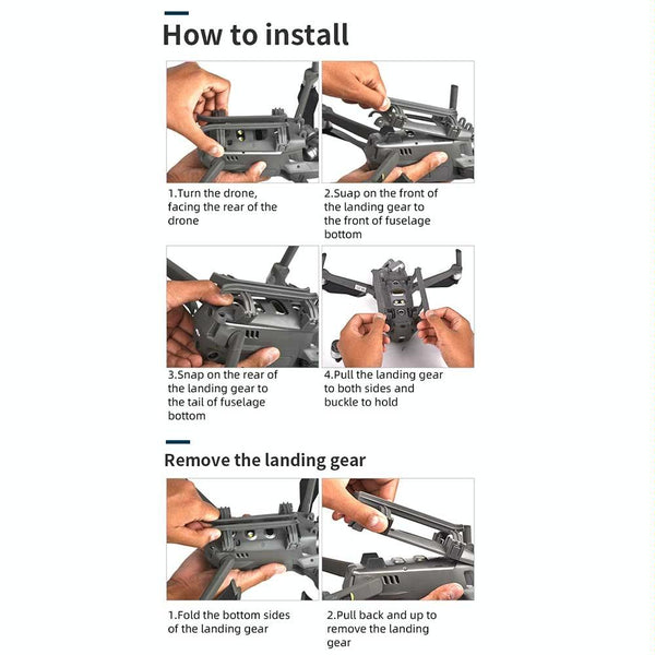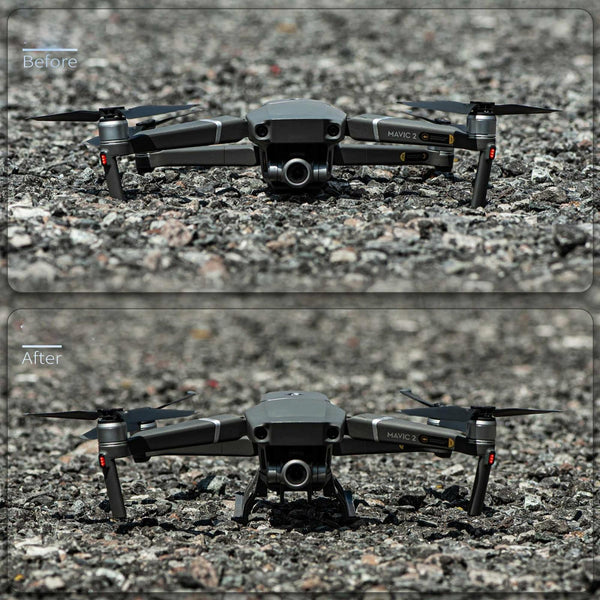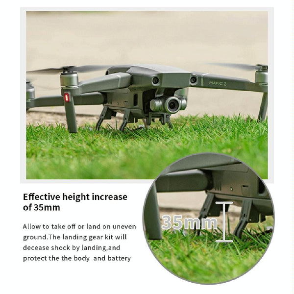2. Effectively increase the height of the fuselage by 35mm, which can prevent ground debris from contaminating the fuselage or damaging the gimbal when taking off and landing the drone. It can still take off and land on uneven ground.