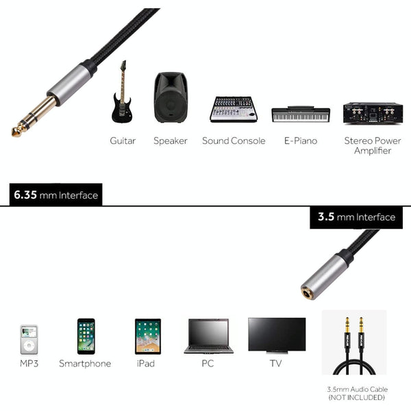 1. The product is to insert a 6.35mm male head into a 3.5mm female head adapter, which is used to connect smart phones, tablets, iPods or headphones with a standard 3.5mm plug to an audio device socket with a 6.35mm stereo. Such as: piano keyboard to 3.5mm adapter, guitar to headphone adapter, amplifier to headphone adapter.