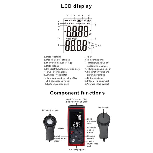 8. Switchable illuminance units (Lx/Fc)and temperature units (C/F). Fc: footcandle; Lx:lux;conversion relationship:1Fc=10.764LX
