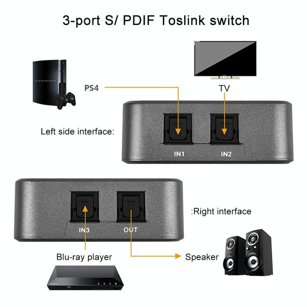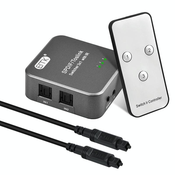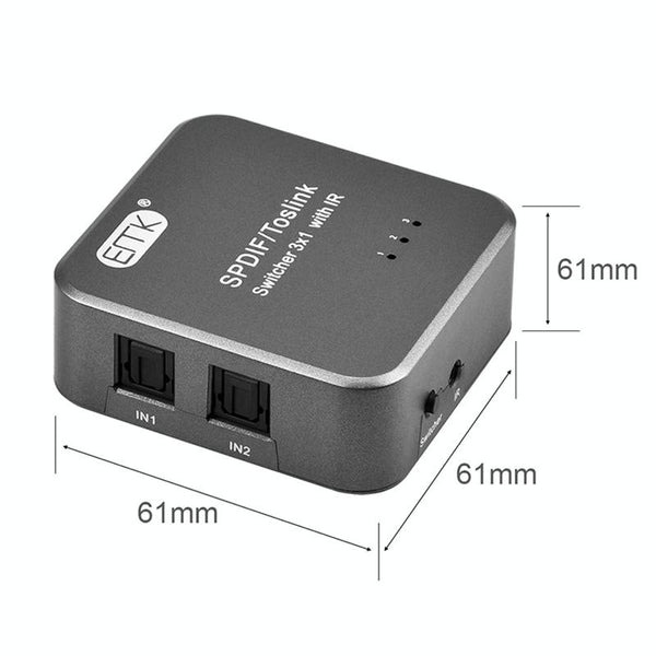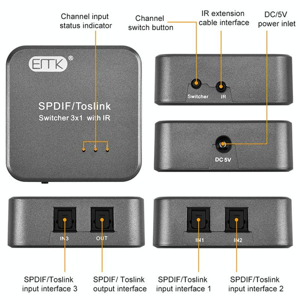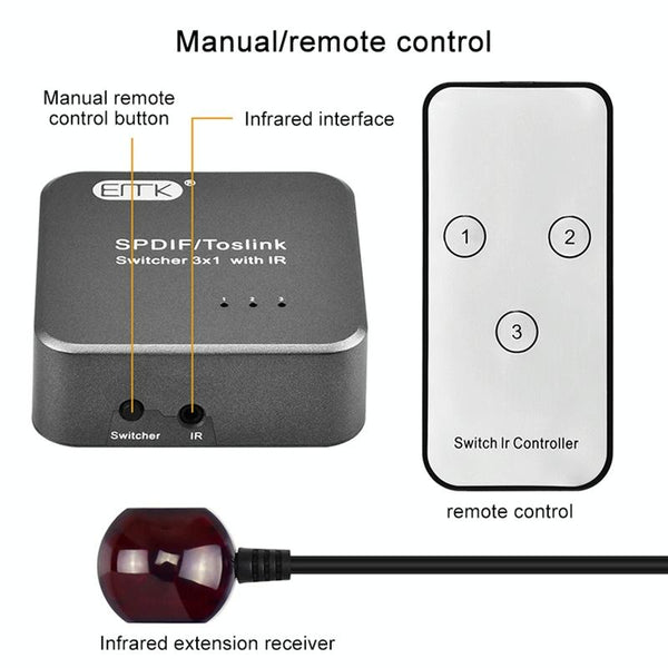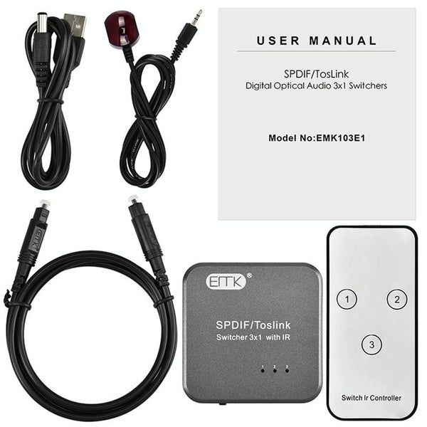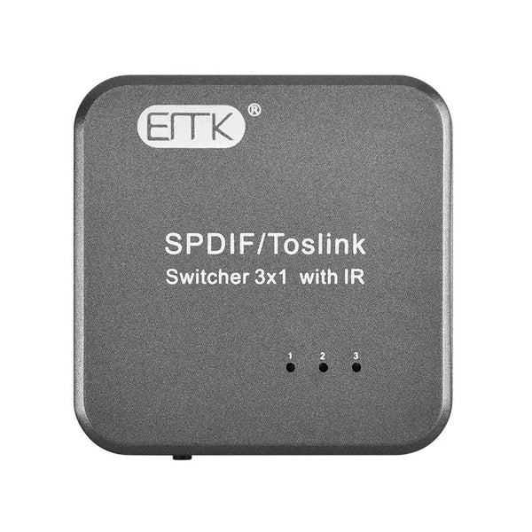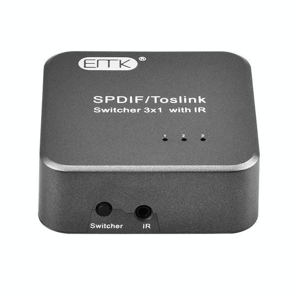 EMK SPDIF/TosLink Digital Optical Audio 3x1 Switcher with IR Controller (Grey)