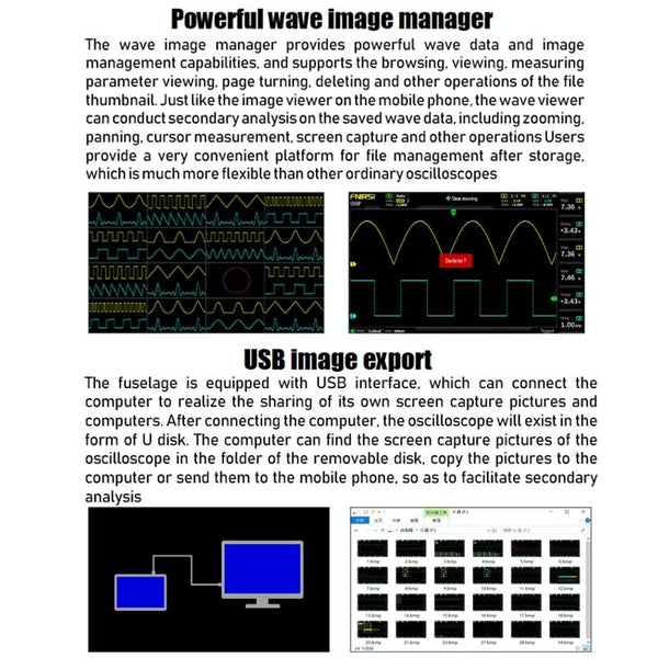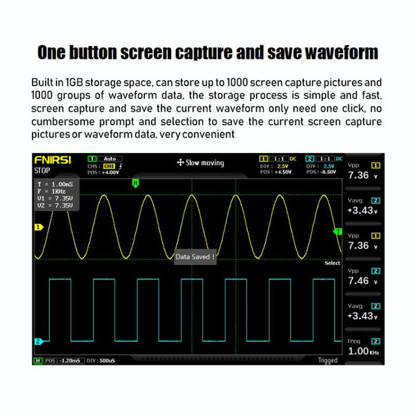 10. Built-in 1GB storage space, can store 1000 screenshots + 1000 sets of waveform data, the storage process is simple and fast, save the current waveform with one key