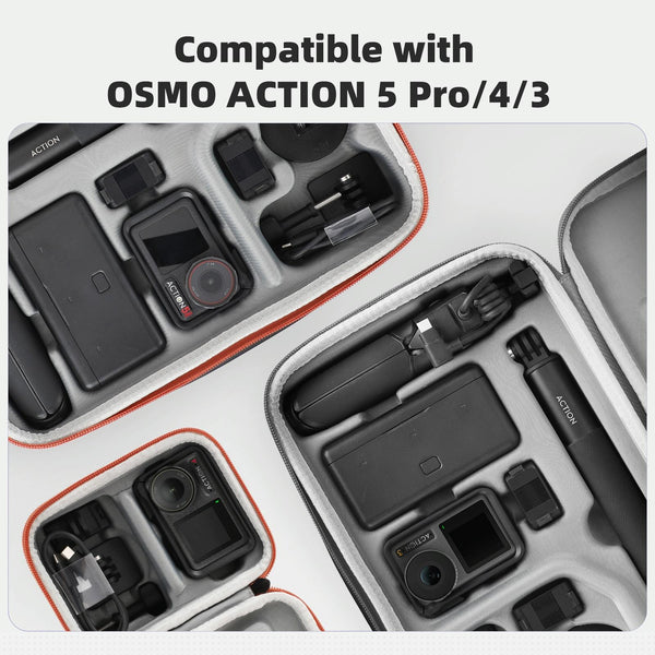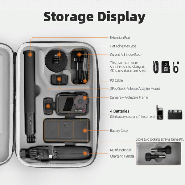 1. Large storage capacity. It can store Action camera, extension rod, charging case, multi-function handle, and expansion parts for daily storage and protection. It also has positions for quick-release parts, adapter brackets and which is enough to store filters, memory cards and data cables.