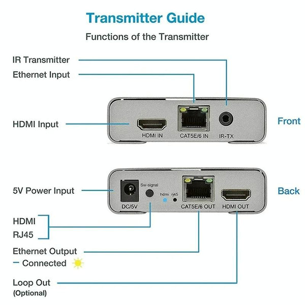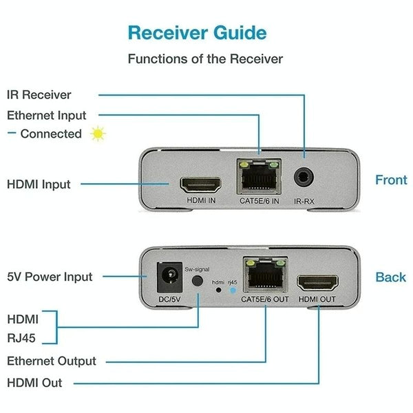 2. HDMI OUT port HD signal output, connect to the monitor, CAT5E/6 OUT port connect to the network cable, long-distance transmission of HD signals