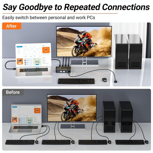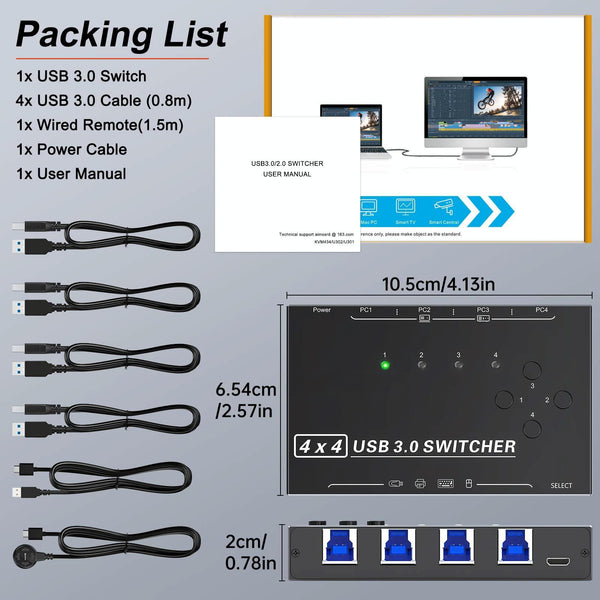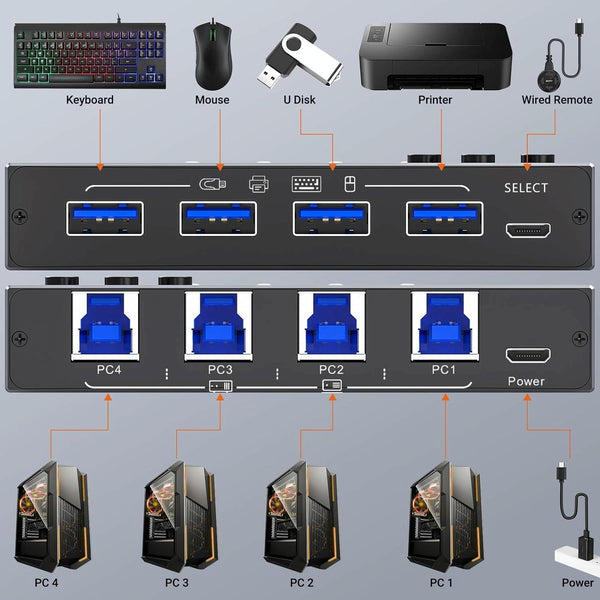 1. Allows switching between 4 computers using a push-button switch or wired remote control to share 4 USB peripherals without having to constantly pull cables or set up complicated network sharing software